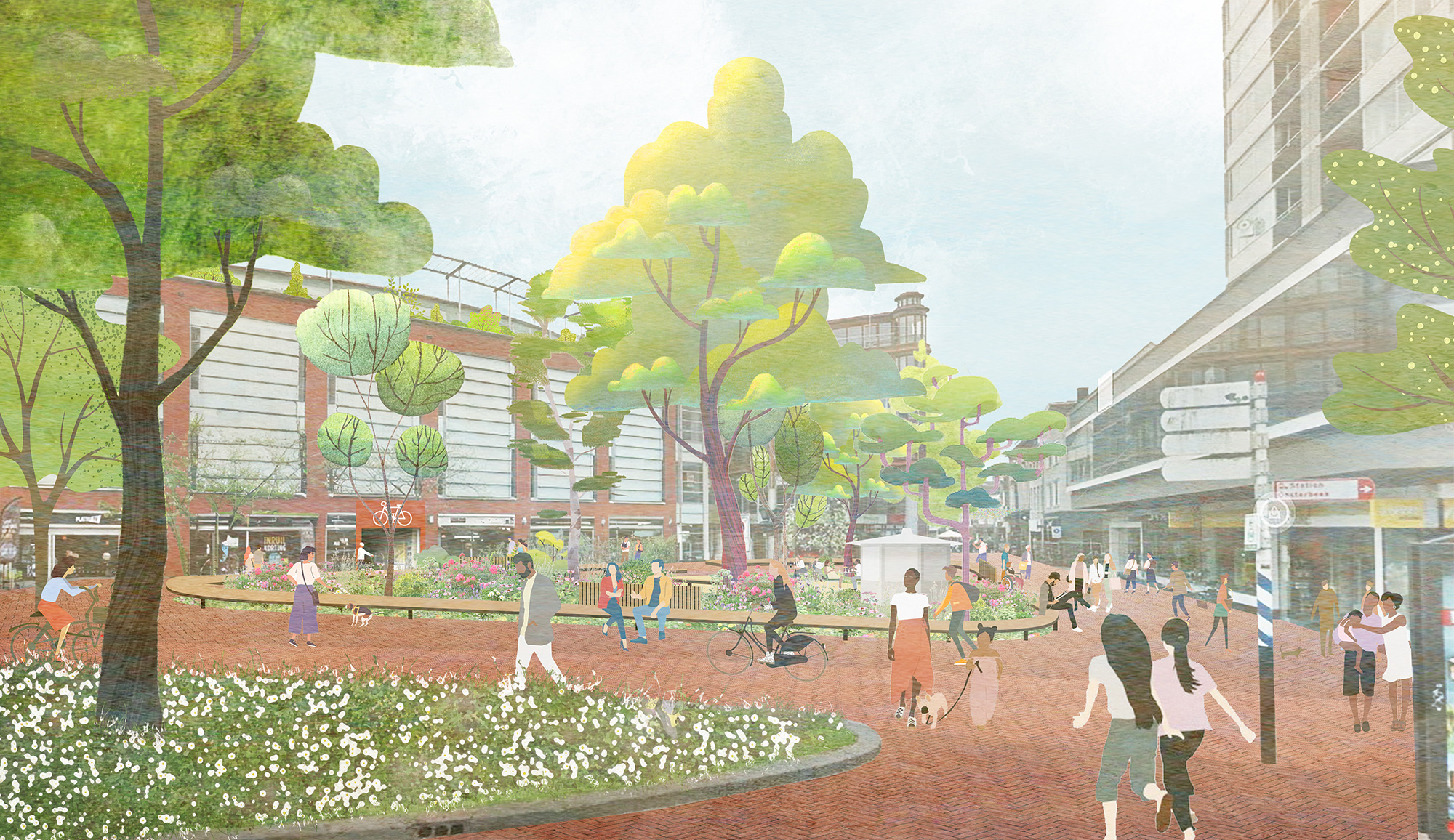 Om een beeld te geven van hoe verschillende plekken er mogelijk in de toekomst uit zouden kunnen komen te zien, zijn voor een aantal plekken sfeerbeelden gemaakt. Dit is nog geen definitief ontwerp, maar het laat zien wat er mogelijk is binnen de visie als we de spelregels gebruiken, wat belangrijk is en ook hoe het beeld van de openbare ruimte kan gaan veranderen. Maar het zijn dus beelden die nu vooral laten zien hoe het eruit zou kunnen zien.
