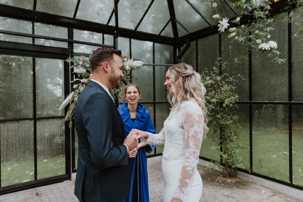 “Het contact met Charlotte was geweldig, vanaf het eerste contact via de mail tot aan het gesprek aan haar keukentafel. We hadden gelijk een hele mooie klik en hebben veel gelachen met elkaar in aanloop naar de ceremonie. Toen duidelijk werd dat ons huwelijk door de coronamaatregelen niet door kon gaan was Charlotte 1 van de eerste die ons een berichtje stuurde … over betrokken gesproken! De manier waarop ze ons verhaal heeft verwoord was zo mooi en bijzonder. Ze heeft de goede balans gezocht tussen een lach en een traan.